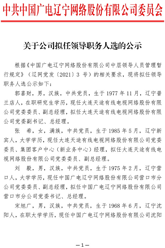 中国广电辽宁网络股份有限公司(简称中国广电辽宁公司)前身为成立于2010年2月的北方联合广播电视网络股份有限公司,系中央国有文化企业——中国广电网络股份有限公司省级子公司、辽宁省国有文化高新技术企业,是按照现代企业制度打造的集网络建设、传输、运营及多功能开发与应用为一体综合网络运营商。