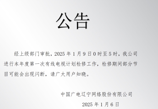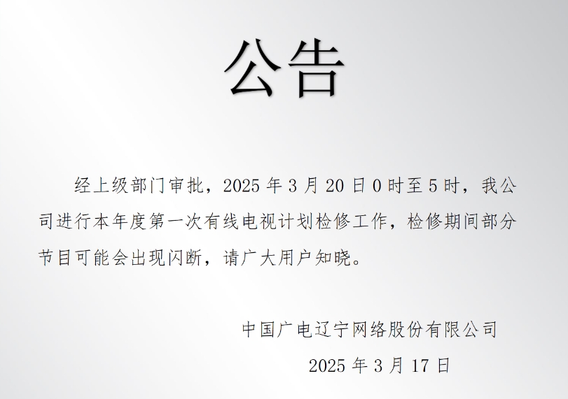 经上级部门审批,2025年3月20日0时至5时,我公司进行本年度第一次有线电视计划检修工作,检修期间部分节目可能会出现闪断,请广大用户知晓。