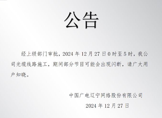 经上级部门审批,2024年12月27日0时至5时,我公司光缆线路施工,期间部分节目可能会出现闪断,请广大用户知晓。