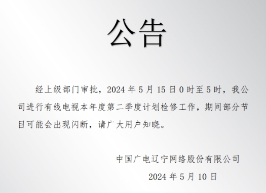 经上级部门审批,2024年7月23日0时至5时,我公司进行本年度第三季度有线电视计划检修工作,检修期间部分节目可能会出现闪断,请广大用户知晓。