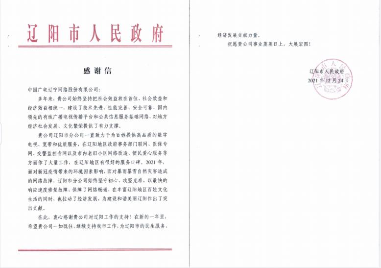 2021年12月24日,中国广电辽宁网络股份有限公司(简称中国广电辽宁公司)收到来自辽阳市人民政府的《感谢信》。这封热情洋溢的感谢信,字里行间体现着辽阳市人民政府对中国广电辽宁公司辽阳市分公司始终致力于为百姓提供高品质数字电视、宽带和优质服务的崇高敬意,对辽阳市分公司干部员工争做新冠疫情“逆行者”,快速修复暴雨暴雪自然灾害造成的网络故障,确保有线电视网络畅通的充分认可和高度赞誉。