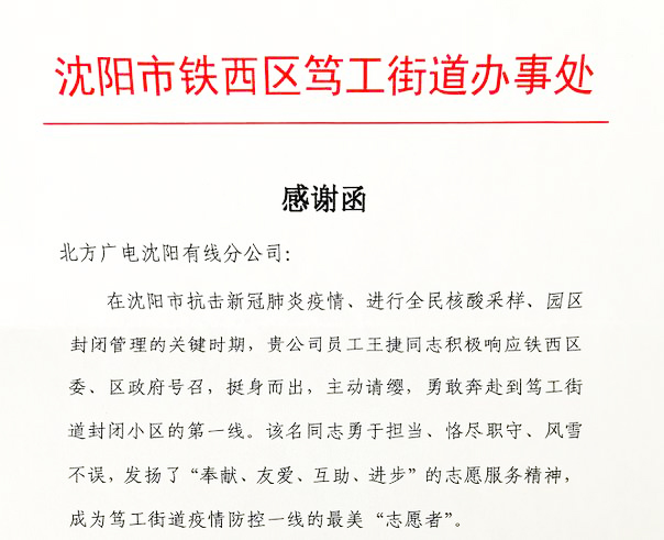 1月19日,yl34511线路中心网络公司沈阳分公司接到沈阳市铁西区笃工街道发来的感谢函,对公司员工王捷同志在沈阳市抗击新冠疫情期间做出的突出贡献表示由衷的感谢。