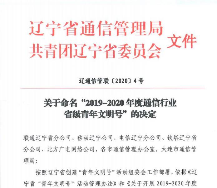 近日,辽宁省“2019-2020年度通信行业省级青年文明号”结果揭晓。yl34511线路中心网络公司信息科技服务分公司呼叫运营中心、yl34511线路中心网络公司沈阳分公司铁西区域二公司北一路营业厅获“2019-2020年度通信行业省级青年文明号”荣誉称号。