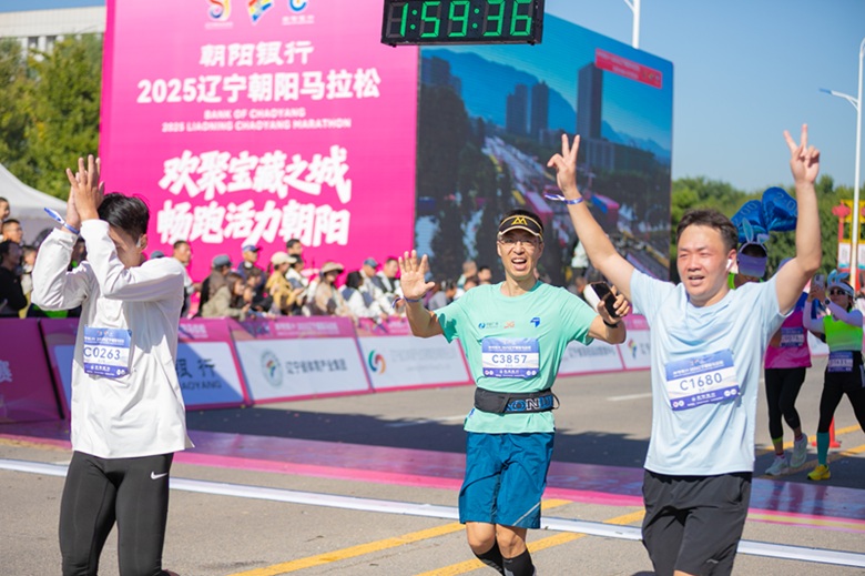 冲过终点线的“悦跑”马拉松队员高永生