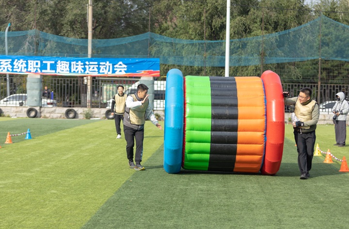 “财源滚滚”是集趣味性、娱乐性和竞技性于一体的比赛项目,既有力量的角逐,又有智慧的较量,既展示个人竞技水平,又考验团队协作能力。队员们化身“车轮部件”,在同行接力中传递着快乐与激情。
