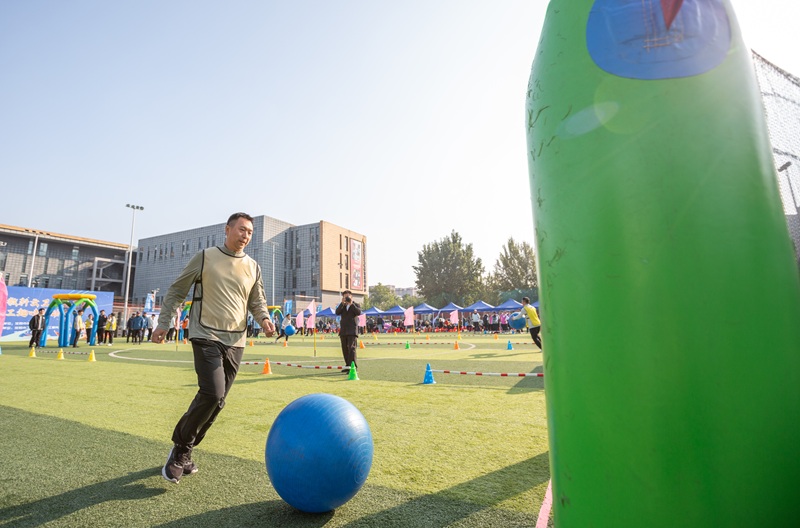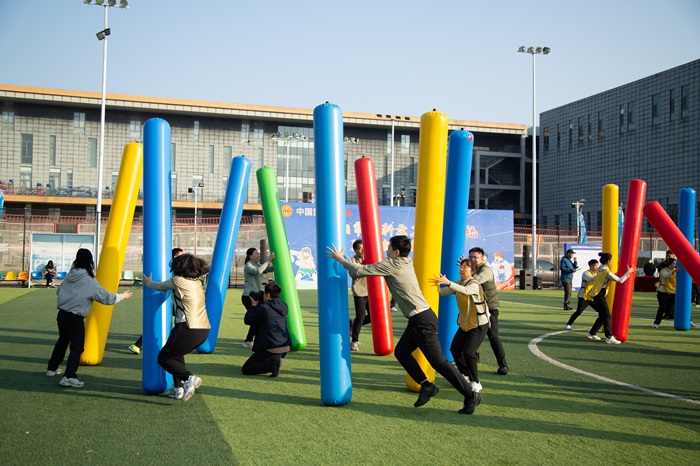 “拥抱梦想”是本场趣味运动会中难度较大的团队协作项目,将篮球技巧融于足球力量之中,在保持平衡的同时完成传球、越障和接力动作。队员们在欢声笑语中冲刺终点线。
