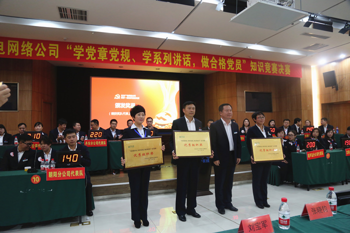 决赛中,各党支部代表队精力集中、反应敏捷,竞赛气氛紧张激烈、精彩迭出、扣人心弦,参赛党员们出色的表现赢得了在场观众的阵阵掌声。在个人必答和共答环节各队不分伯仲;抢答环节你追我赶,差距渐生;在最后的风险答题环节中,选手们更是沉稳应对,胆大心细,斗智斗勇。经过一个多小时的激烈角逐,营口分公司代表队冠压群雄,以280分获得第一名;锦州分公司和丹东分公司代表队紧随其后,获得二等奖;铁岭分公司、辽阳分公司和葫芦岛分公司获得三等奖;盘锦分公司、阜新分公司、鞍山分公司、沈阳分公司、抚顺分公司和朝阳分公司获得优秀奖。铁岭分公司、营口分公司和锦州分公司党委,因“两学一做”知识竞赛活动组织有力而荣获优秀组织奖,其他分公司党委(总支)荣获组织奖。