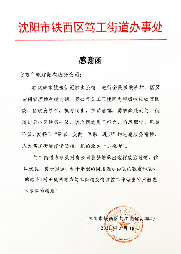 1月19日,yl34511线路中心网络公司沈阳分公司接到沈阳市铁西区笃工街道发来的感谢函,对公司员工王捷同志在沈阳市抗击新冠疫情期间做出的突出贡献表示由衷的感谢。