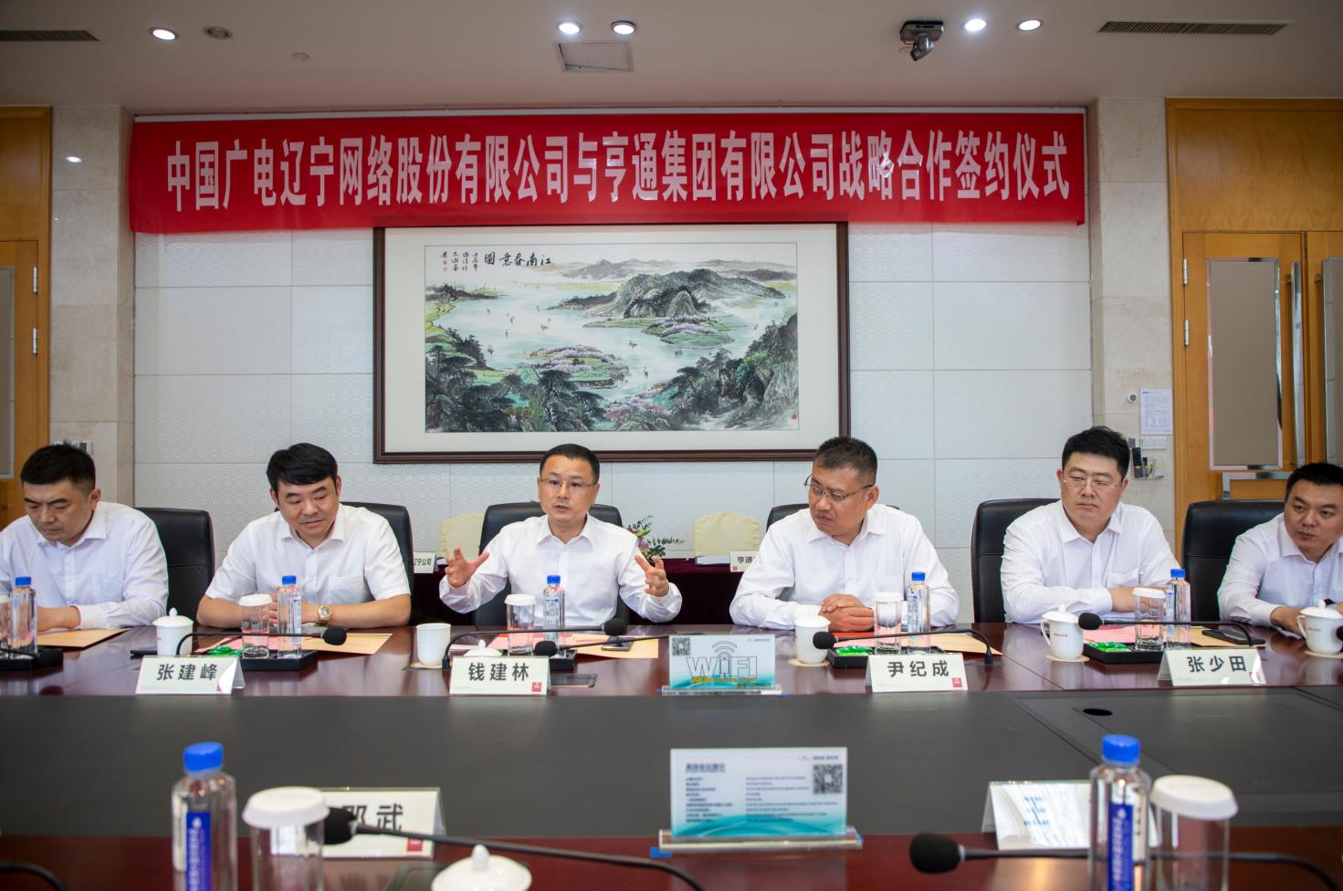 2021年6月4日上午,中国广电辽宁网络股份有限公司(简称辽宁广电)与亨通集团有限公司(简称亨通集团)战略合作协议签约仪式在苏州亨通集团总部举行。辽宁广电党委书记、董事长、总经理曾绍武,总工程师王兆恒,总经理助理王婷与亨通集团执行总裁钱建林,运营管理中心总经理尹纪成,通信产业集团副总裁、亨通光电总经理张建峰出席了签约仪式。