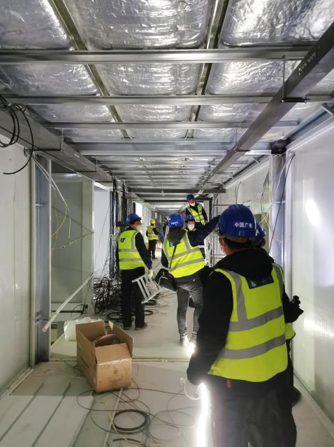沈阳市方舱医院应急工程总建筑面积约5.1万平方米,分两期改造建设,一期建筑面积3.1万平方米,可提供1000张治疗床位及1.3万平方米的医疗物资仓库;二期建筑面积2万平方米,改造完成后可再提供1000张治疗床位。中国广电辽宁公司承接了包括建设无线AP点位、监控摄像头、场外穿线等弱点工程项目,敷设同轴电缆(3*1.5)10万余米,安装200个摄像头点位、无线AP 300多个点位。截至目前,累计投入施工200余人。