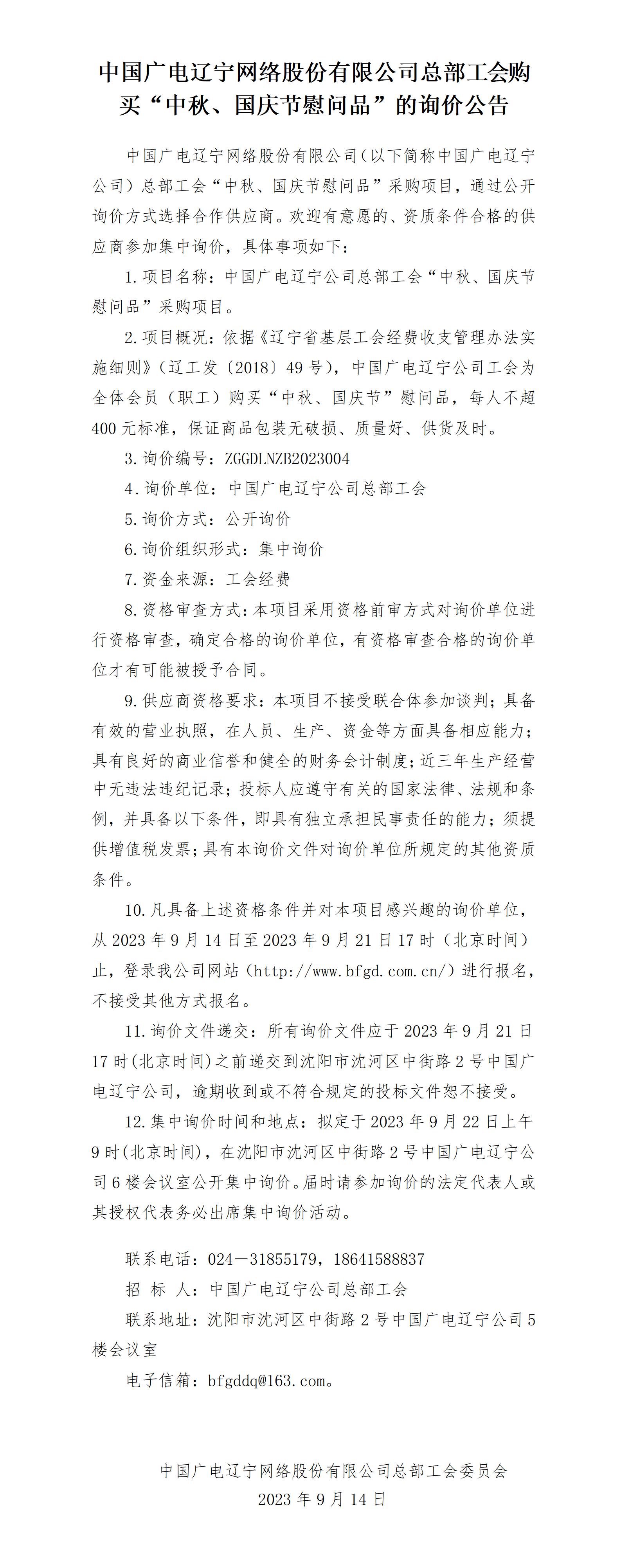 中国广电辽宁网络股份有限公司总部工会购买“中秋、国庆节慰问品”的询价公告