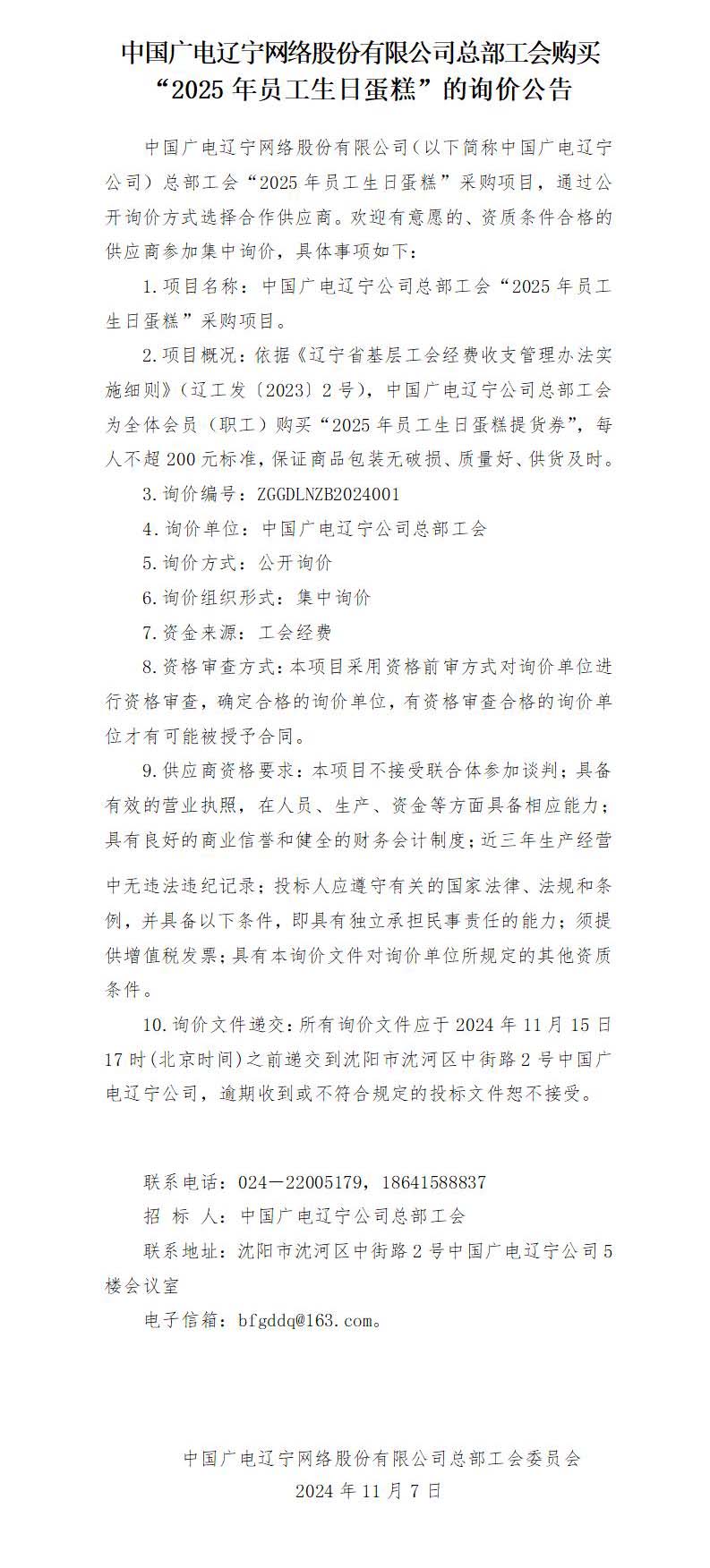 中国广电辽宁网络股份有限公司总部工会购买“2025年员工生日蛋糕”的询价公告