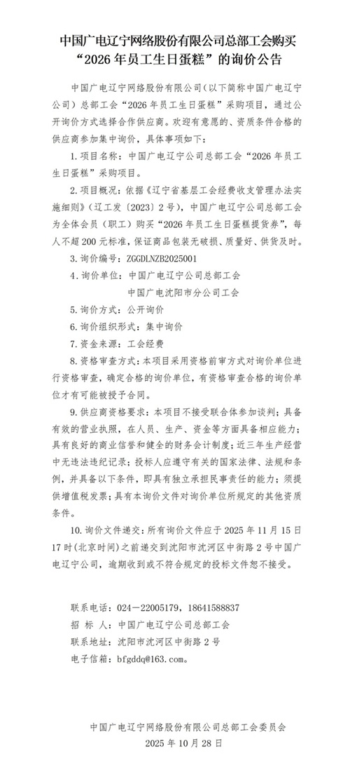中国广电辽宁网络股份有限公司总部工会购买“2025年员工生日蛋糕”的询价公告