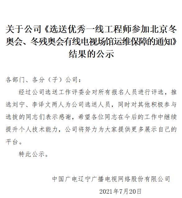 关于公司《选送优秀一线工程师参加北京冬奥会、冬残奥会有线电视场馆运维保障的通知》结果的公示