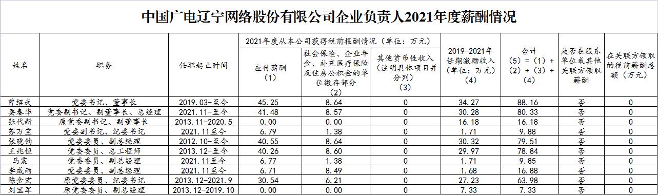 中国广电辽宁公司2021年企业负责人薪酬公示