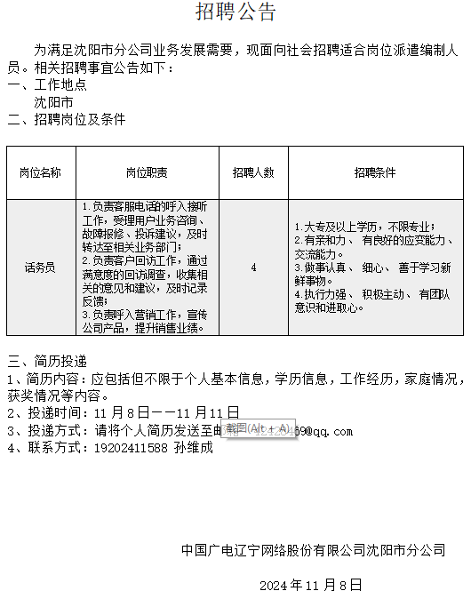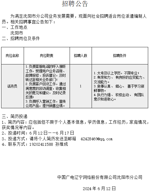 沈阳市分公司话务员招聘公告